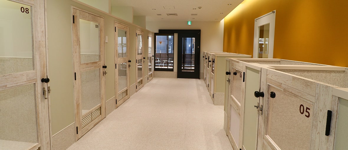 ペットホテル:ゆとりある快適空間で、一時預かりから長期ステイまで対応。温湿度管理や照明制御などが施されています。